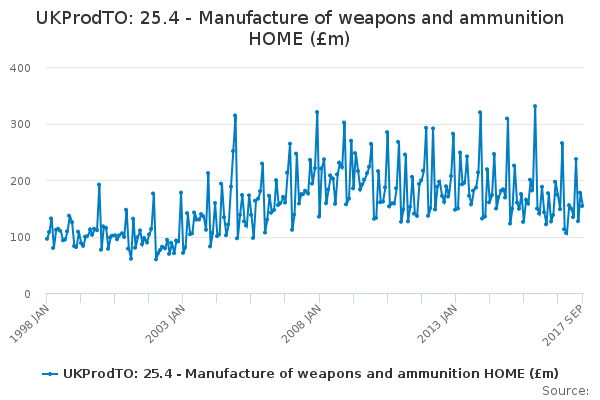 Download this time seriesUKProdTO: 25.4 - Manufacture of weapons and ammunition HOME (£m)