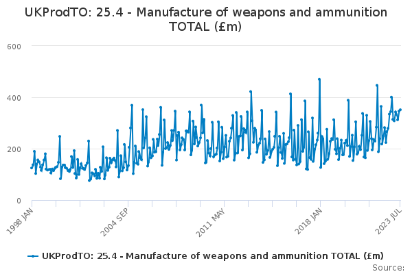 Download this time seriesUKProdTO: 25.4 - Manufacture of weapons and ammunition TOTAL (£m)
