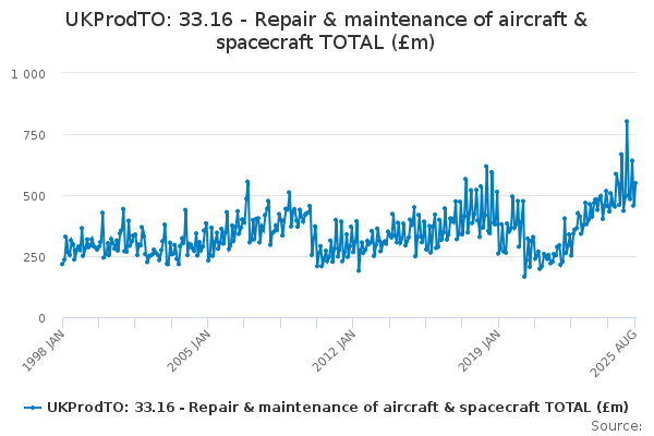 Download this time seriesUKProdTO: 33.16 - Repair & maintenance of aircraft & spacecraft TOTAL (£m)
