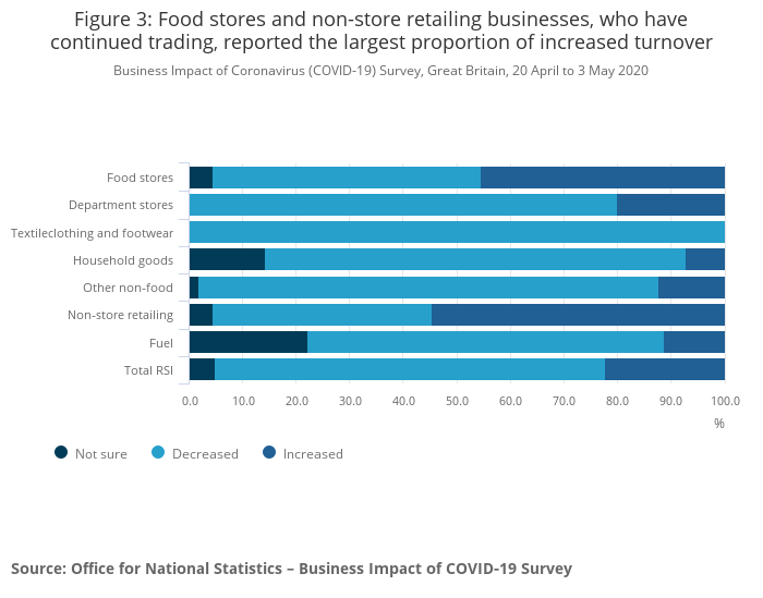 Looking at information gathered from retailers in both the Retail Sales Inquiry and the fortnightly Business Impact of Coronavirus (COVID-19) Survey (BICS), the BICS asked of those businesses continuing to trade, whether retailers experienced an increase or decrease to turnover between 20 April and 3 May (Figure 3).