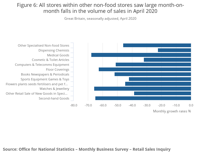All stores within the non-food store sector had record falls, with clothing stores experiencing the strongest month on month decline at 50.2%; continuing the sharp decline in March where sales fell by 34.9%.