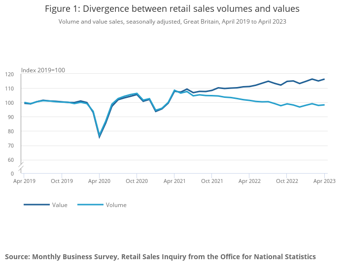 Volume and value sales, seasonally adjusted, Great Britain, April 2019 to April 2023