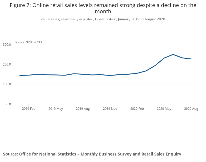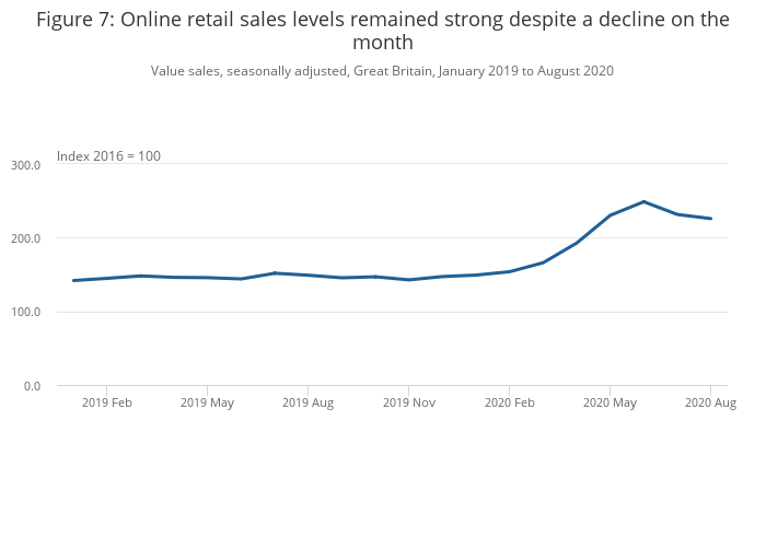 Online retail sales fell by 2.5% in August when compared with July, but the strong growth experienced over the pandemic has meant that sales were still 46.8% higher than February’s pre-pandemic levels.