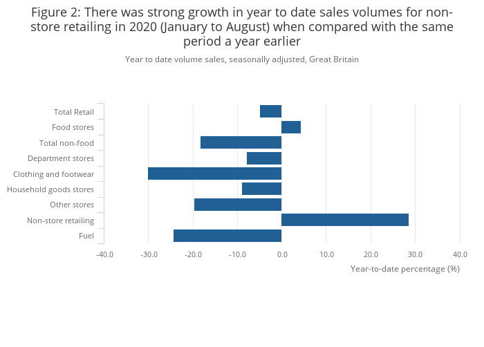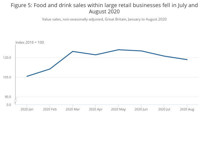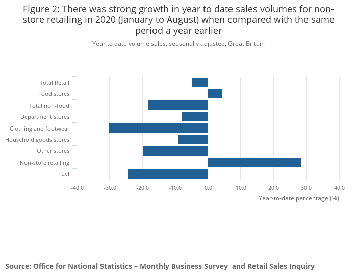 These declines in value sales may be because of many businesses reopening from July, resulting in less online spending in August. Other parts of the economy reopened, such as restaurants and bars, which may have impacted sales within food stores as online sales fell by 4.6% in August.