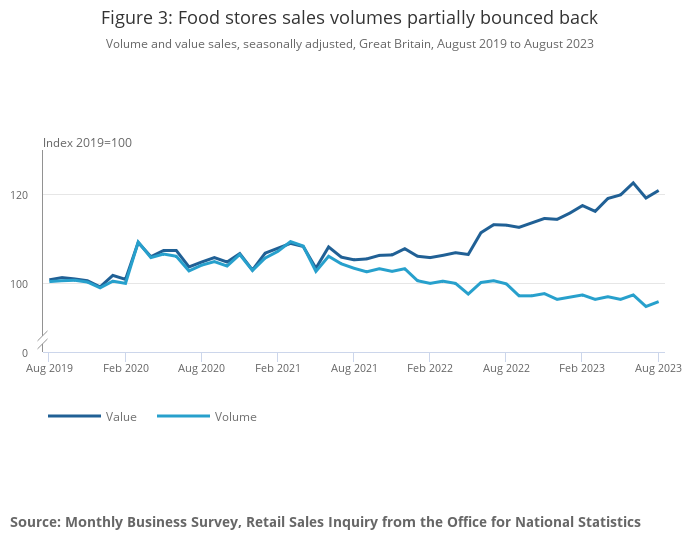 Food stores sales volumes rose by 1.2% in August 2023, following a fall of 2.6% in July 2023 when supermarkets reported that the wet weather reduced clothing sales, and supermarket food sales also fell back.