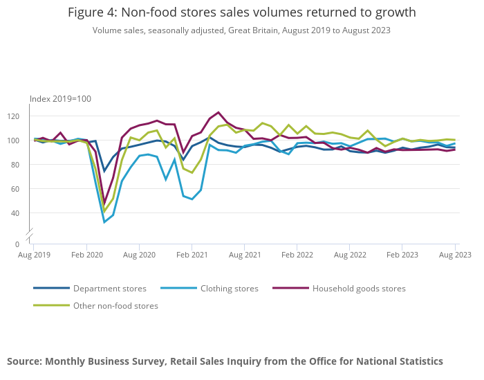 Non-food stores sales volumes grew by 0.6% in August 2023, following a fall of 1.2% in July 2023 when poor weather reduced footfall.