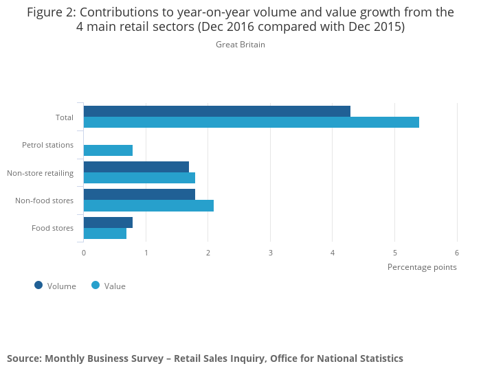 Download this chart Figure 2: Contributions to year-on-year volume and value growth from the 4 main retail sectors (Dec 2016 compared with Dec 2015)