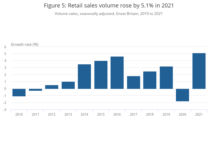 Between 2020 and 2021 the volume of retail sales rose by 5.1%, which is the strongest growth since 2004 (when it was also 5.1%); it was last higher in 2002 (5.7%). However, growth between 2020 and 2021 should be interpreted with caution given restrictions on travel and non-essential retail which contributed to a fall in sales during 2020.