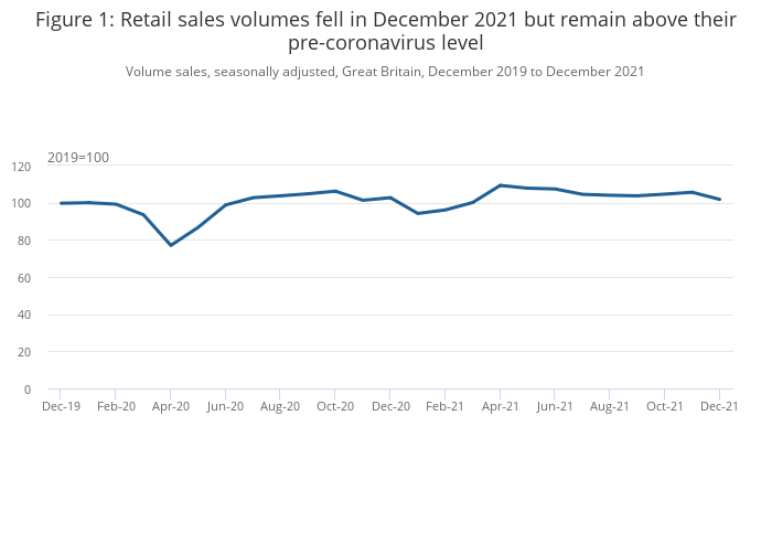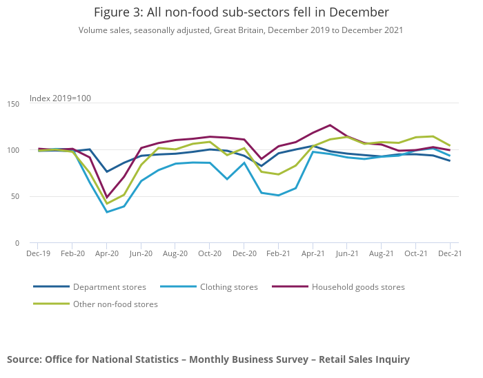 Non-food stores reported a fall of 7.1% in sales volumes because of falls in each of its sub-sectors (department stores, clothing stores, other non-food stores and household stores). Feedback from some retailers suggested that the Omicron variant, which the Coronavirus Infection survey reports to have increased rapidly during December 2021, and associated reduced footfall, may have impacted sales.