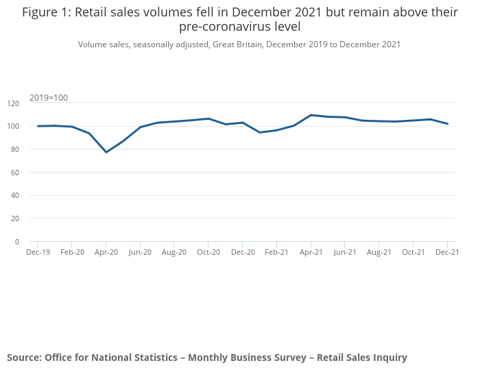 Figure 1: Retail sales volumes fell in December 2021 but remain above their pre-coronavirus level
