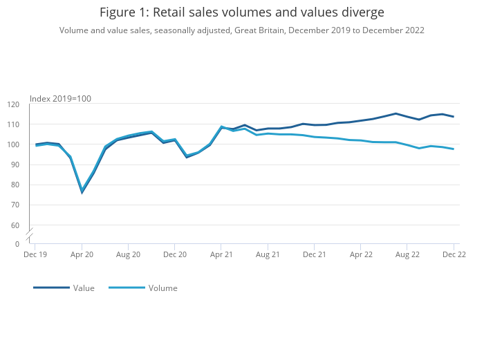 Image .csv .xlsFigure 1 shows the quantity bought (volume) and amount spent (value) in retail sales over time. Sales volumes fell by 1.0% in December 2022, continuing a broad downward trend that has been seen since the lifting of hospitality restrictions in summer 2021.