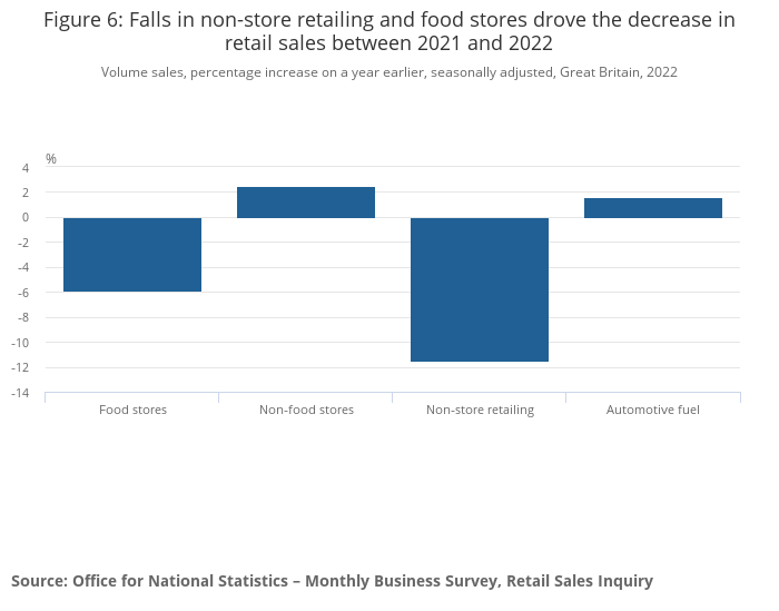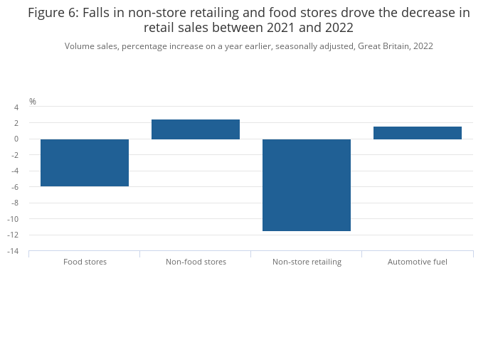 Figure 6: Falls in non-store retailing and food stores drove the decrease in retail sales between 2021 and 2022
