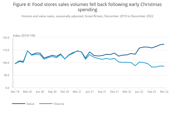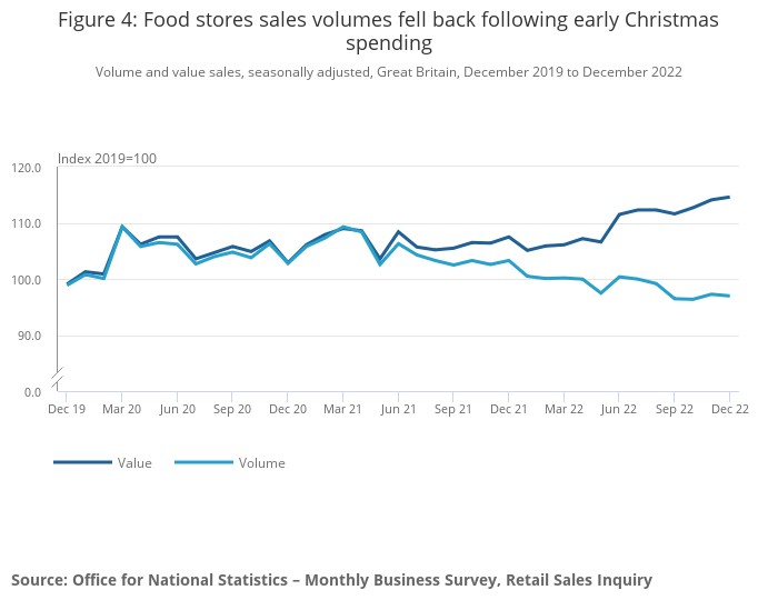 Food store sales volumes fell by 0.3% in December 2022 from a rise of 1.0% in November, with comments from some retailers suggesting that customers stocked up early for Christmas.