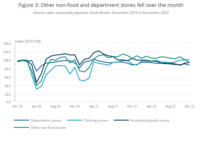 Department stores sales volumes fell by 3.1% in December 2022, from a rise of 2.1% in November. Retailers reported that longer Black Friday sales contributed to the November increase.