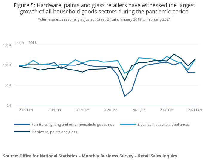Figure 5: Hardware, paints and glass retailers have witnessed the largest growth of all household goods sectors during the pandemic period