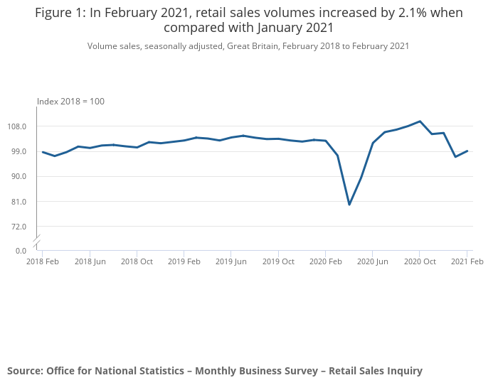 Figure 1: In February 2021, retail sales volumes increased by 2.1% when compared with January 2021