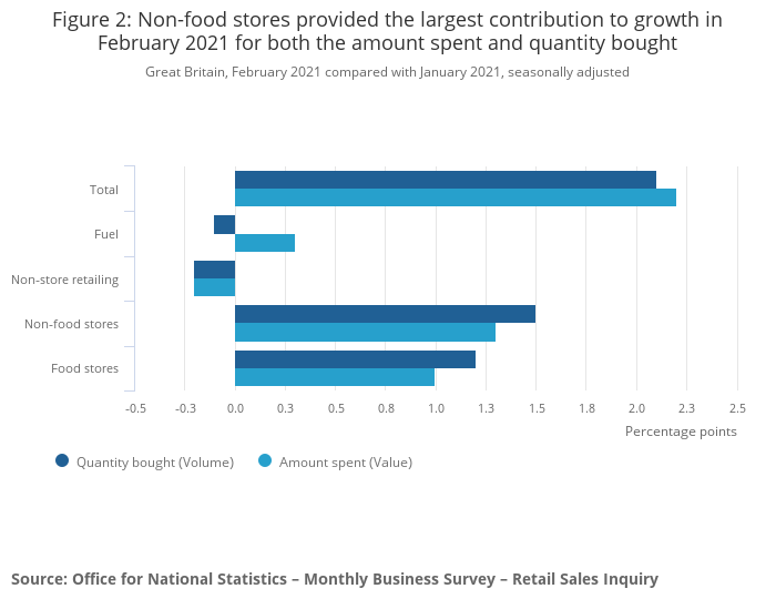 Figure 2: Non-food stores provided the largest contribution to growth in February 2021 for both the amount spent and quantity bought