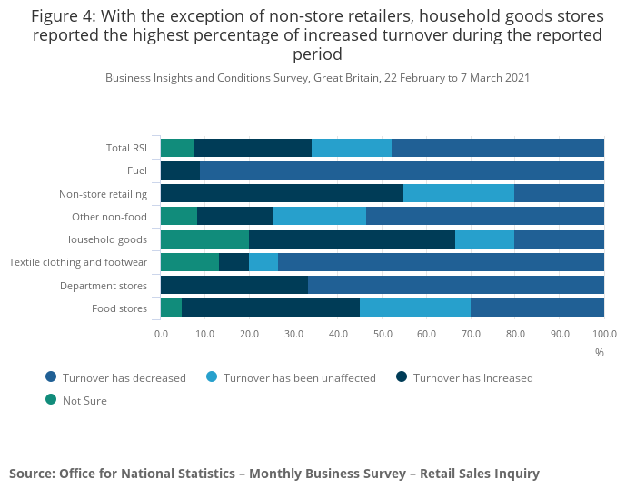 Figure 4: With the exception of non-store retailers, household goods stores reported the highest percentage of increased turnover during the reported period
