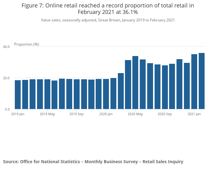 Download this chart Figure 7: Online retail reached a record proportion of total retail in February 2021 at 36.1%