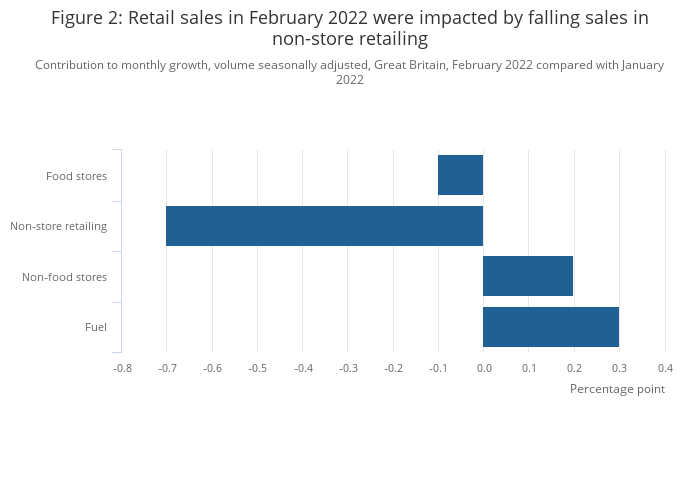 Image .csv .xlsFigure 2 shows the contributions to the 0.3% month-on-month fall in overall retail sales volumes (quantity bought) in February 2022. This highlights that non-store retailing had the largest contributions to the fall over the month.