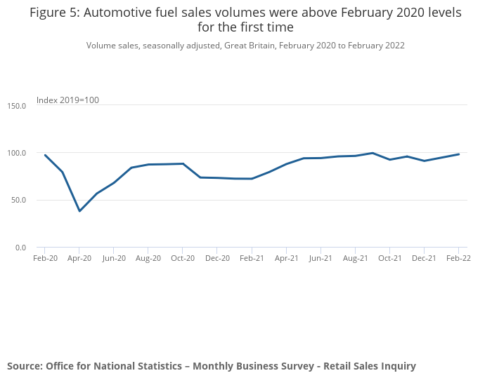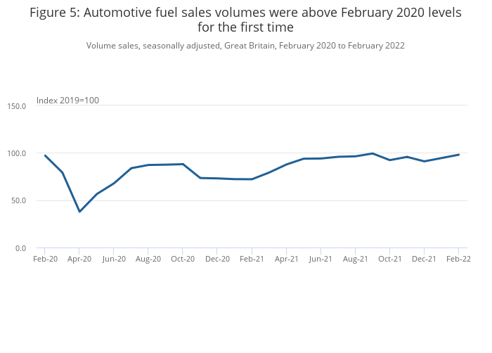 Automotive fuel sales volumes rose by 3.6% in February 2022 as the lifting of Plan B restrictions in England at the end of January 2022 increased travel; sales volumes were above pre-coronavirus February 2022 levels (0.9%) for the first time.
