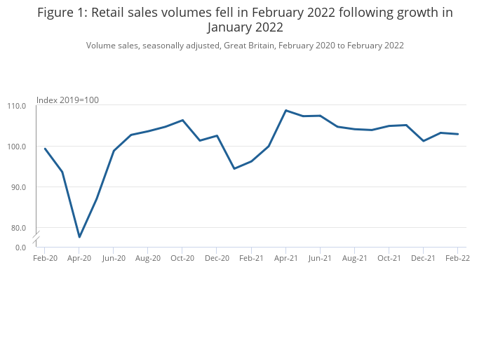 Retail sales volumes fell by 0.3% in February 2022 following a rise of 1.9% (unrevised) in January 2022; sales volumes were 3.7% above their pre-coronavirus (COVID-19) February 2020 levels.