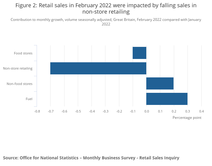 Figure 2: Retail sales in February 2022 were impacted by falling sales in non-store retailing