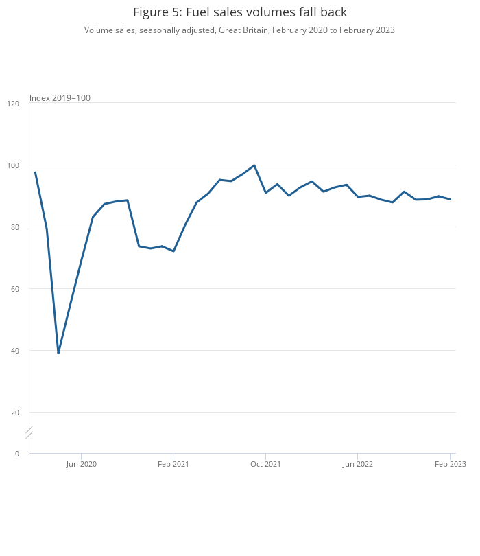 Automotive fuel sales volumes fell by 1.1% in February 2023 following a rise of 1.1% in January 2023 when rail strikes may have increased car travel.