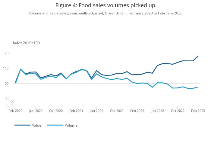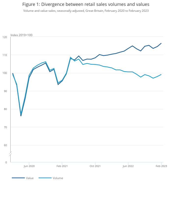 Volume and value sales, seasonally adjusted, Great Britain, February 2020 to February 2023