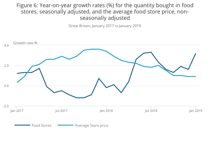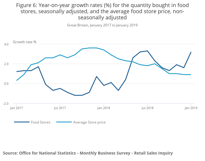 As food store prices experienced a general slowdown throughout 2018, the quantity bought in January 2019 returned to the strong growth experienced in the summer months at 3.2%.