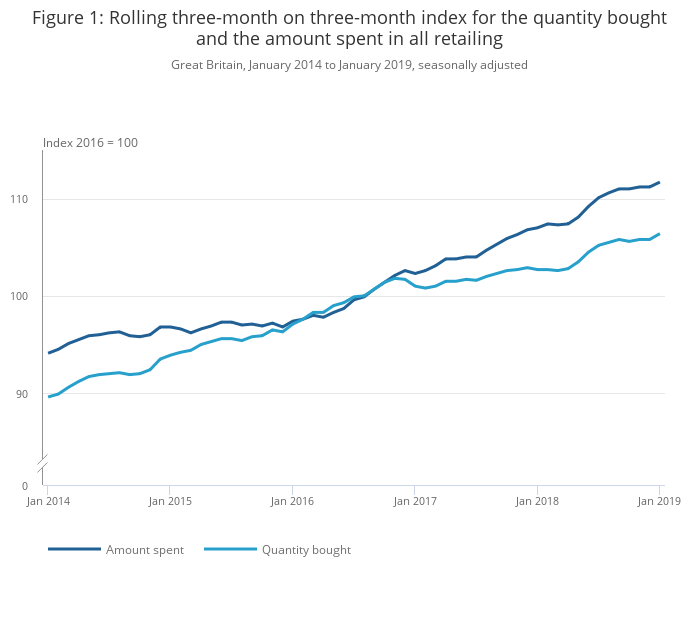 From January 2015, the trend in the amount spent remained relatively flat as the quantity bought increased at a faster rate up to January 2016. Sales began to increase at a stronger rate of growth from January 2016 for both the amount spent and quantity bought. From January 2017, the amount spent continued to increase at a steady rate, while the quantity of goods bought slowed to increase at a slower pace. In later months, from September 2018, growths for both measures slowed in the three months to January 2019.