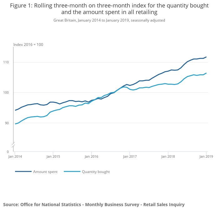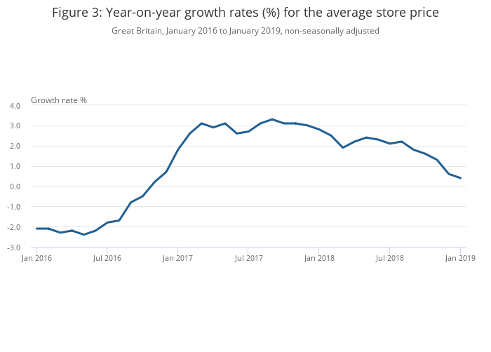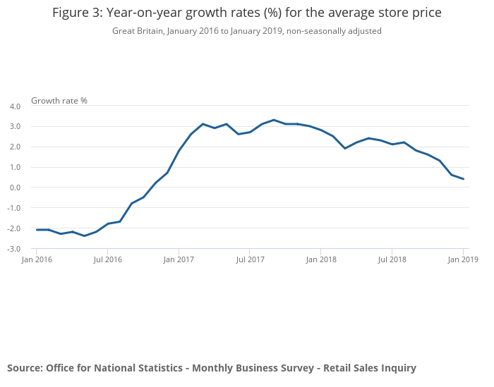 While a general slowdown to the year-on-year growth followed this sharp increase in May 2018, January 2019 has broadly returned to the same rate experienced in the summer with a growth rate of 4.2%; the highest since December 2016. This has coincided with a slowdown in the average store price (or often referred to as the “implied deflator”) to 0.4% (Figure 3).