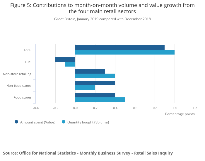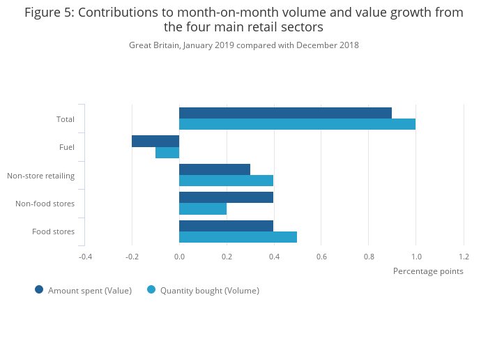 Food stores was the largest contributor towards the increase seen in January 2019 for the quantity bought, at 0.5 percentage points. Non-store retailing and non-food stores also reported positive contributions of 0.4 and 0.2 percentage points respectively. In contrast, fuel stores contributed negatively to the quantity bought, at negative 0.1 percentage points.