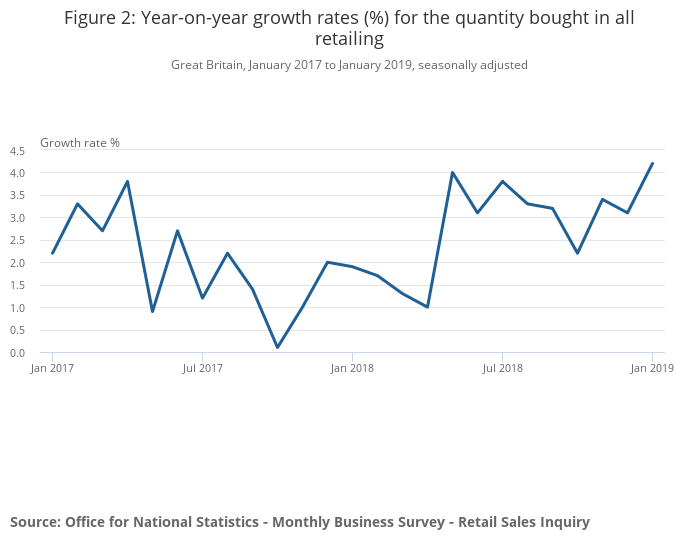 The quantity bought in textile, clothing and footwear stores showed strong year-on-year growth at 5.5% as stores took advantage of the January sales, with a year-on-year price fall of 0.9%.
