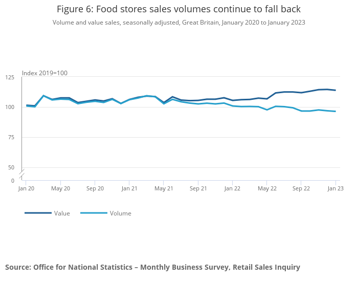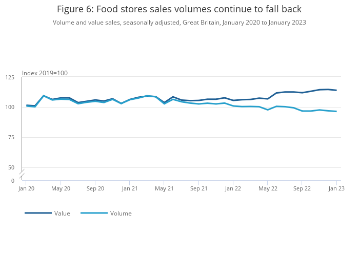 Image .csv .xlsFood store sales volumes fell by 0.5% in January 2023 following a fall of 0.7% in December 2022, with continued feedback of a decline in volumes sold (quantity bought) because of the increased cost of living and food prices.
