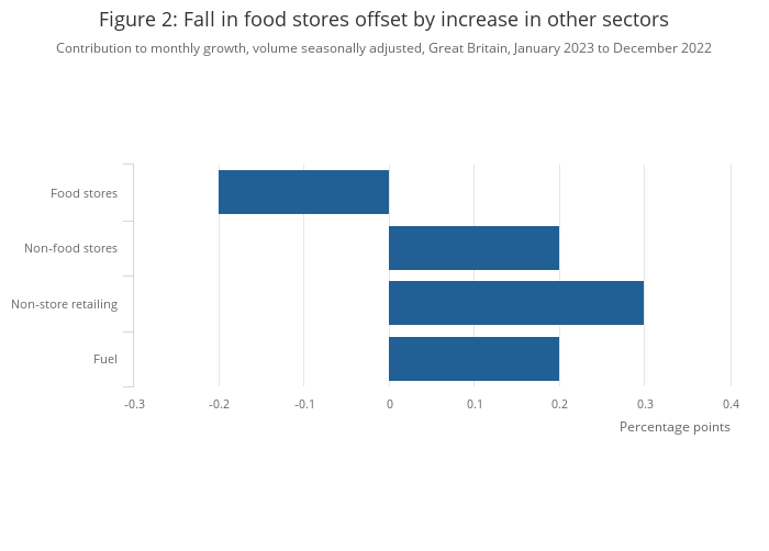 Contribution to monthly growth, volume seasonally adjusted, Great Britain, January 2023 to December 2022