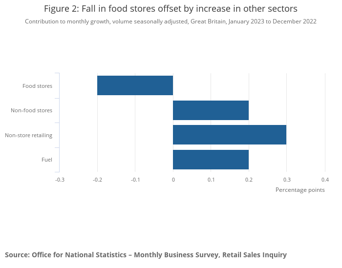 Non-food stores sales volumes rose by 0.6% over the month, following a fall of 2.5% in December 2022 with feedback from retailers that growth was supported by sales promotions; despite this pickup, sales volumes were 2.9% below their pre-coronavirus February 2020 levels.