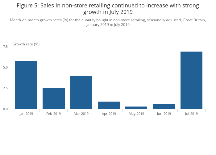 Download this chart Figure 5: Sales in non-store retailing continued to increase with strong growth in July 2019