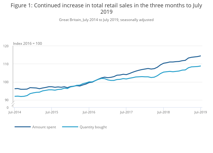 In contrast, the only sector to contribute negatively to the quantity bought was food stores at negative 0.2 percentage points. This is compared with strong growth in July 2018, which has not been higher since October 2016.