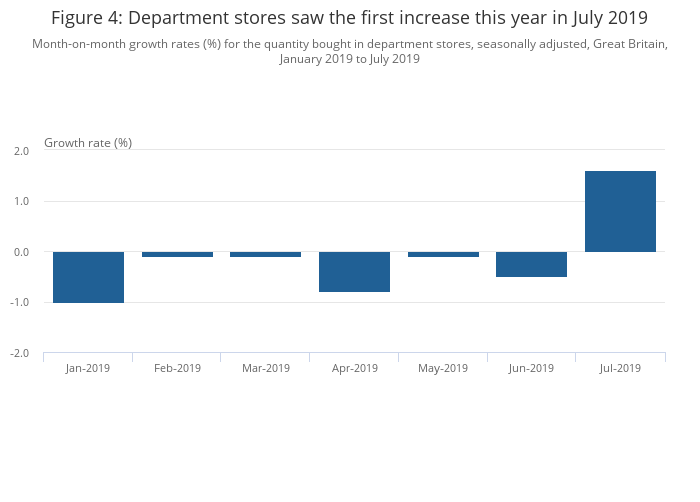 Image .csv .xlsAs shown in Figure 4, this is the first growth reported in department stores this year at 1.6% in July 2019. Department stores have been declining for six consecutive months from January 2019, partly because of store closures but July’s growth bucks this trend. Department store retailers have suggested that new clothes lines in addition to extra promotions have helped with sales for this month. However, monthly estimates can be more volatile.