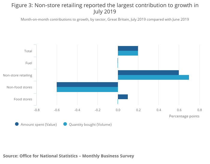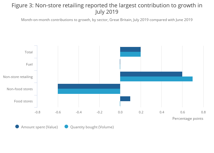 In contrast, non-food stores were the largest negative contributor in July 2019, with the amount spent and quantity bought both at negative 0.6 percentage points.