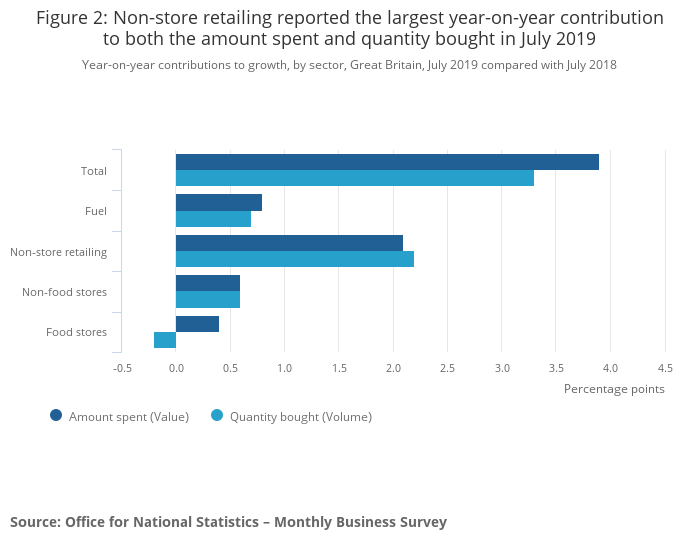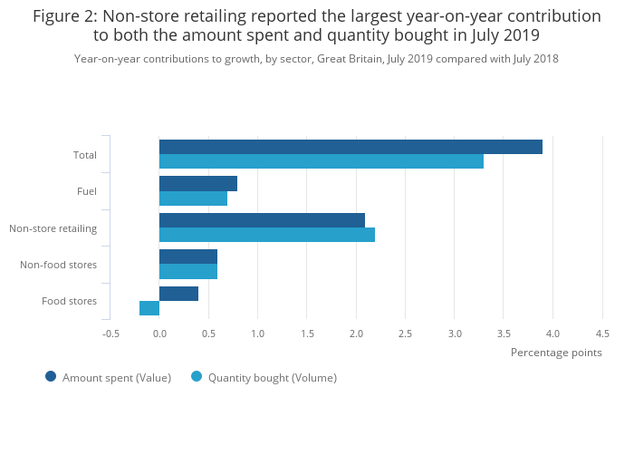 Download this chart Figure 2: Non-store retailing reported the largest year-on-year contribution to both the amount spent and quantity bought in July 2019