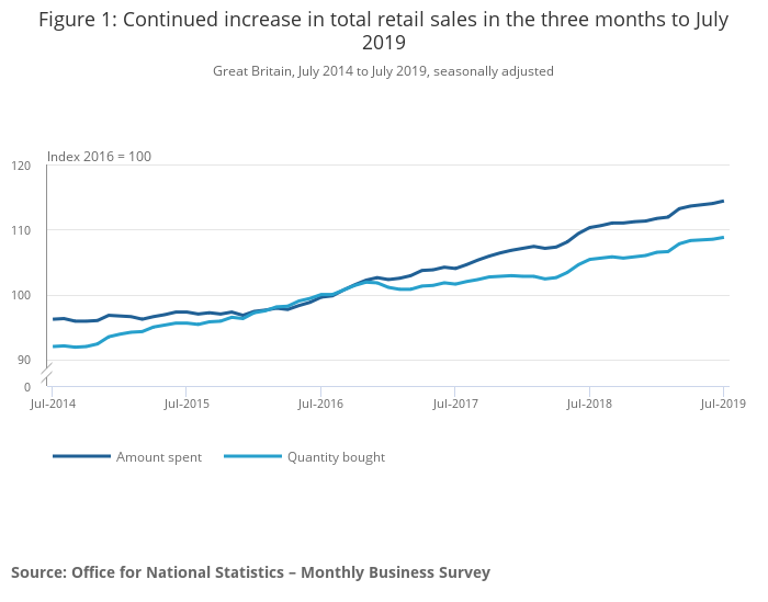Download this chart Figure 1: Continued increase in total retail sales in the three months to July 2019