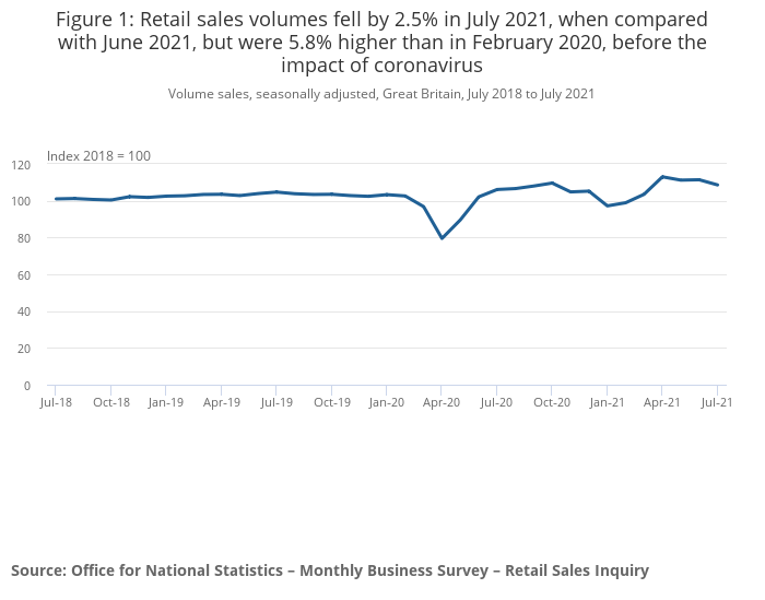 Figure 1: Retail sales volumes fell by 2.5% in July 2021, when compared with June 2021, but were 5.8% higher than in February 2020, before the impact of coronavirus