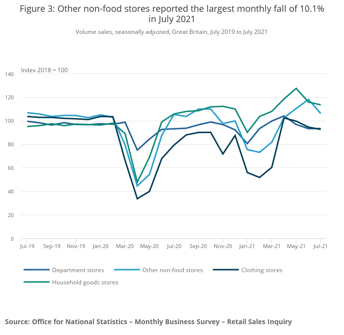 Non-food stores reported a fall of 4.4% in sales volumes in July 2021 when compared with June 2021, driven by falls in other stores (negative 10.1%), such as second-hand goods stores and computer and telecoms equipment stores.
