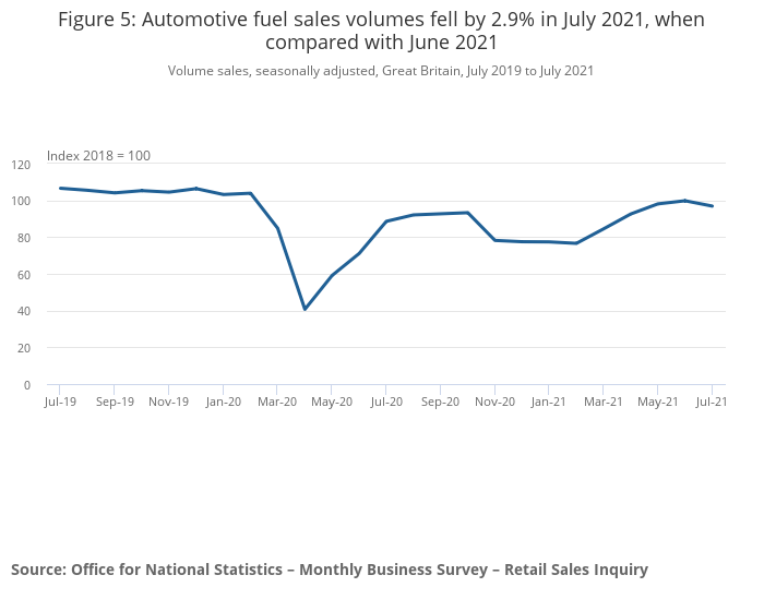Automotive fuel sales volumes fell by 2.9% over the month, its first monthly fall since February 2021; with heavy rainfall in early July impacting road traffic volumes, automotive fuel sales volumes are now 6.7% below their pre-coronavirus pandemic February 2020 levels.