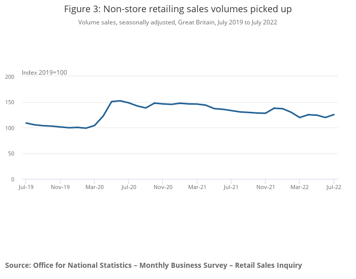 Non-store retailing (predominantly online retailers) sales volumes rose by 4.8% in July 2022; feedback from online retailers suggested that a range of promotions in July 2022 boosted sales.