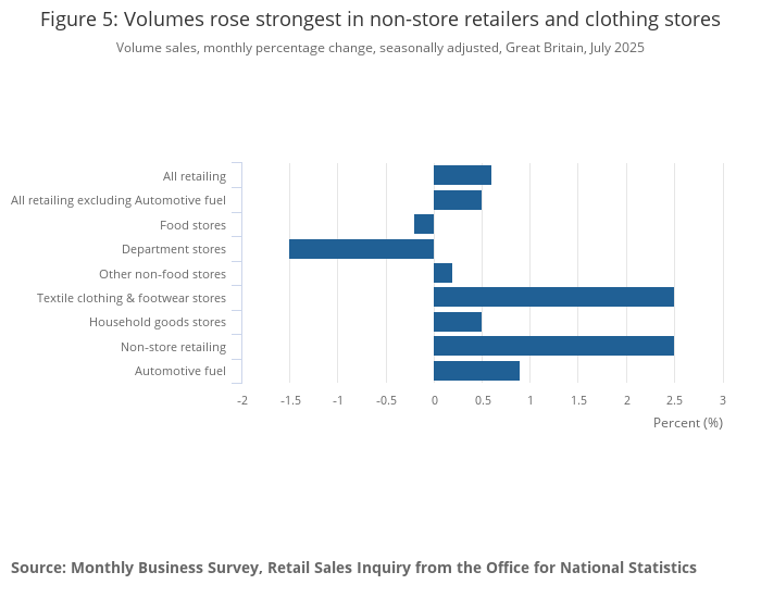 Non-store retailers and clothing stores sales volumes grew strongly in July 2025, which retailers attributed to new products, good weather, and an increase resulting from the UEFA Women’s EURO 2025 tournament.