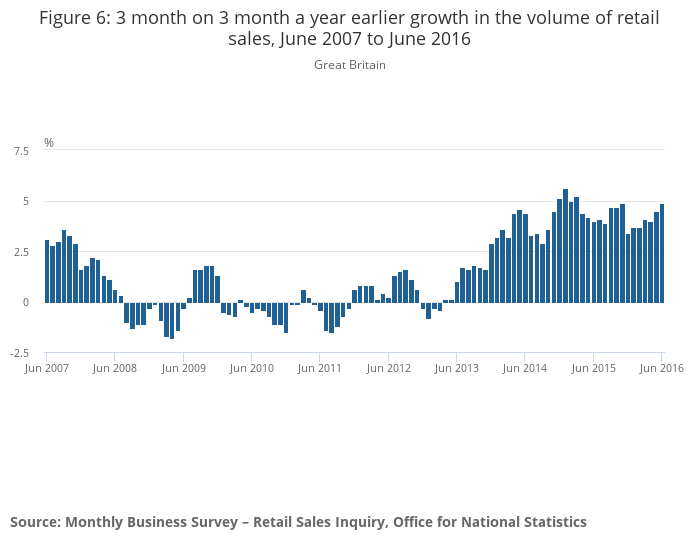 Download this chart Figure 6: 3 month on 3 month a year earlier growth in the volume of retail sales, June 2007 to June 2016
