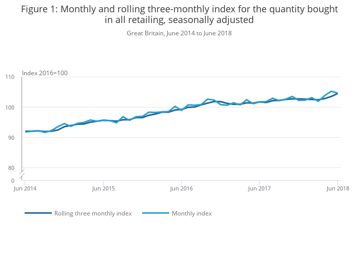 In the three months to June 2018, the quantity bought in retail sales increased by 2.1%; the largest increase since February 2015, with growth across all main sectors.